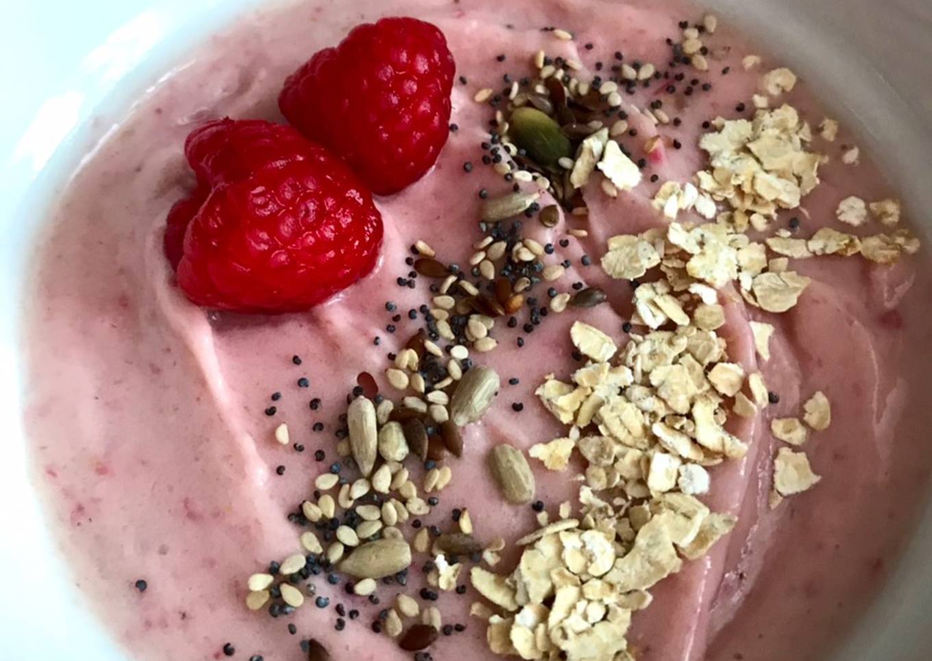 - Decoramos con las frambuesas, la avena y las semillas y LISTO!