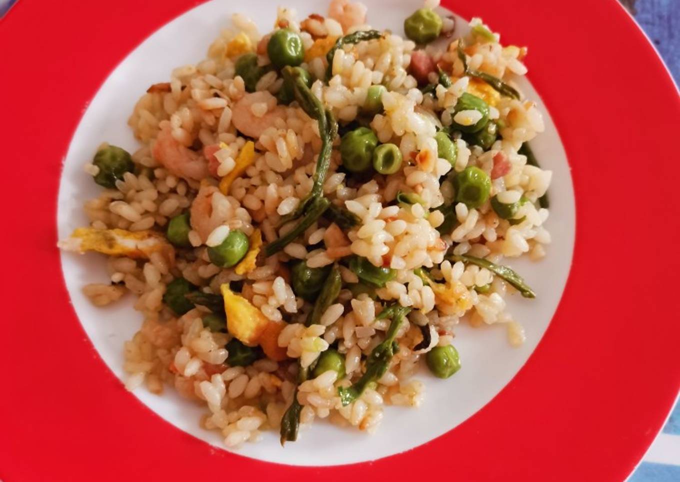 Hello everybody, hope you are having an amazing day today. Today, I'm gonna show you how to prepare a special dish, Arroz salteado con espárragos, gambas y guisantes. One of my favorites. For mine, I will make it a little bit unique. This is gonna smell and look delicious.