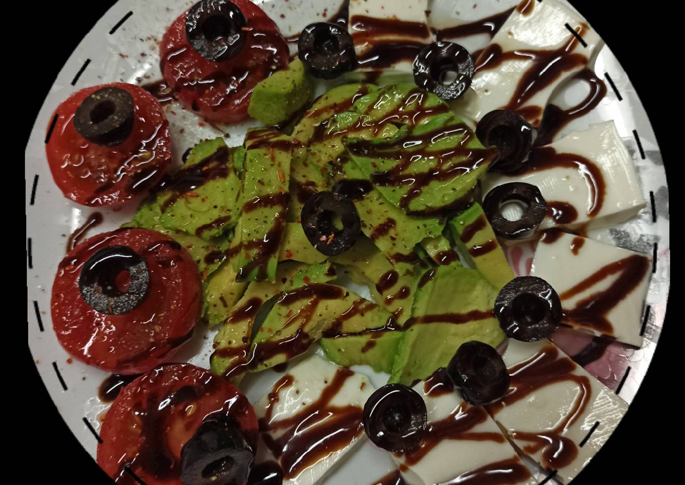 - Lavar y cortar las aceitunas, los tomates y el aguacate, cortar en rodajas también el queso fresco y colocar todo en el plato sazonar con sal, pimienta, sazonador Hispania y rociar al gusto la crema balsámica de Módena y listo para comer súper rápida de hacer y muy saludable