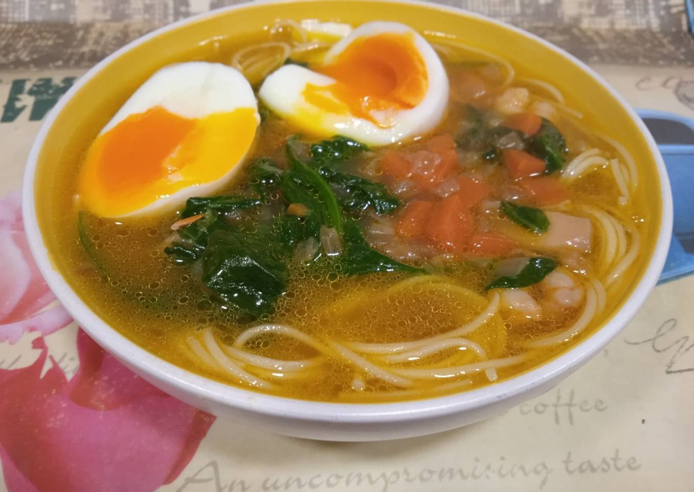 - Poner en cada plato unos fideos y servir el caldo. Poner el huevo cortado por la mitad en cada ración.