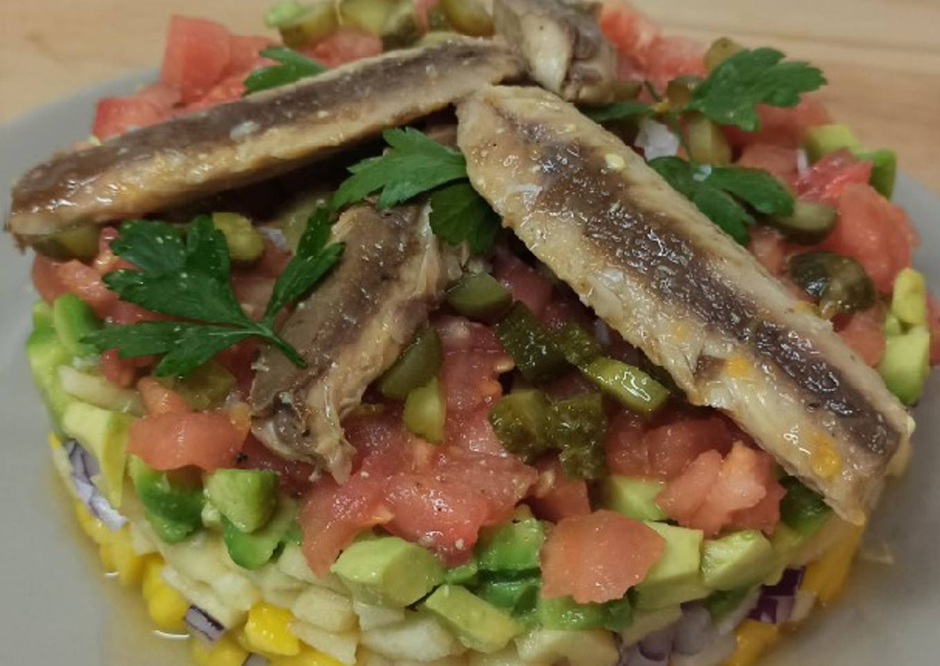 morada, manzana picada, aguacate, tomate picado, pepinillos agridulces. - Poner la caballa en lata en la parte superior de la ensalada y echar la vinagreta de