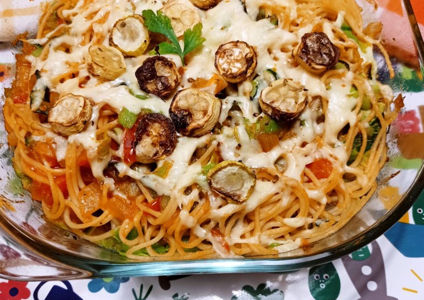 - Añadir el queso rallado a los fideos y adornarlos con las rodajas de calabacines doradas. Hornear (horno precalentado a 180°C) la preparación hasta que el queso se derrita y los fideos estén calientes.