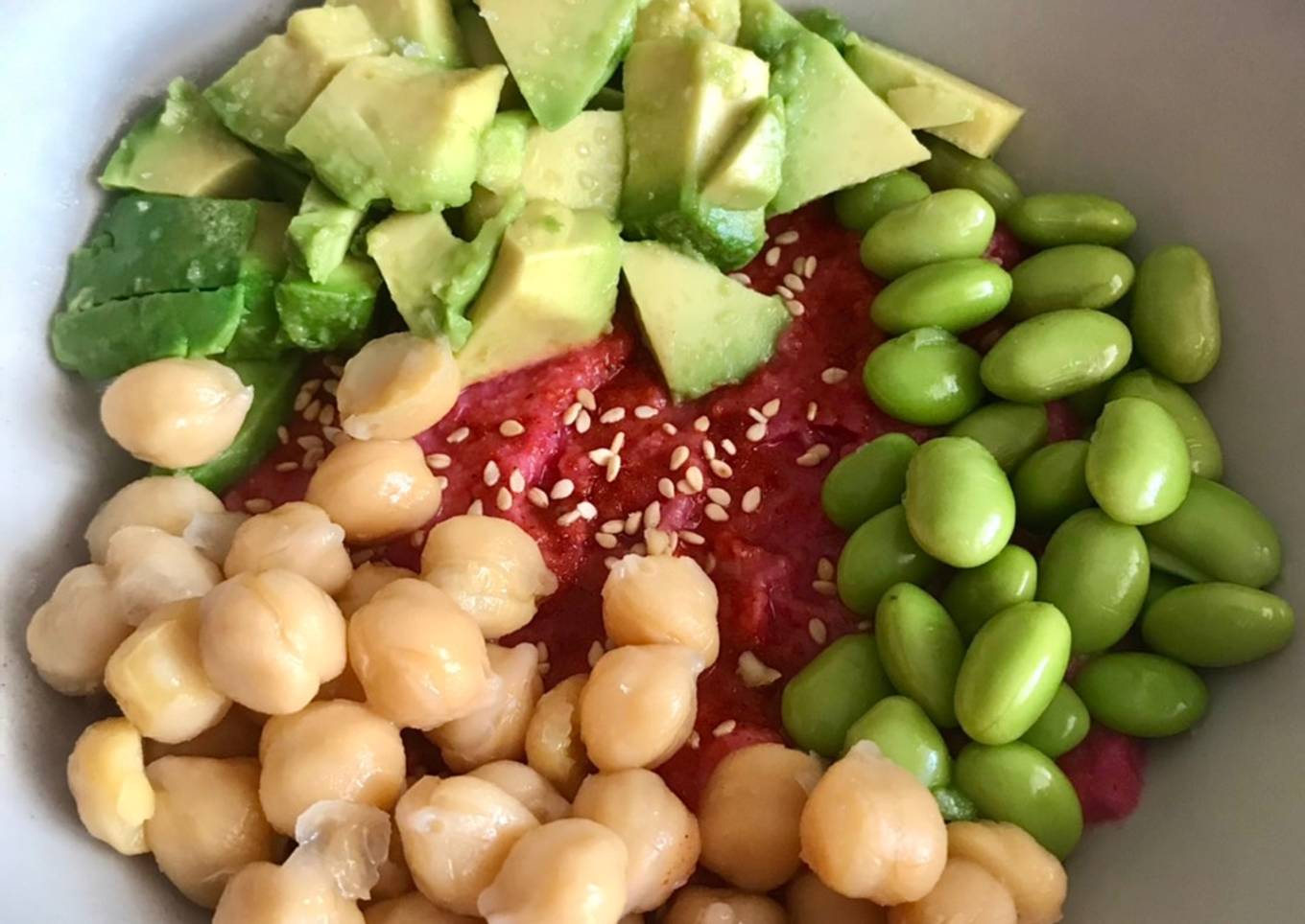 Una vez el edamame cocido lo dejaremos preparado en un plato junto al aguacate y reservaremos para el final. - En el vaso de la batidora añadimos los ingredientes descritos para el hummus y batimos hasta conseguir la textura hummus.