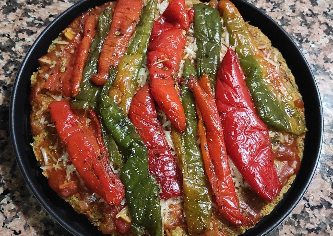 - Una vez horneada la masa, cubrimos con salsa de tomate, queso vegano y encima los pimientos. Hornear unos 10 minutos más a 180°C. Bon profit!!!
