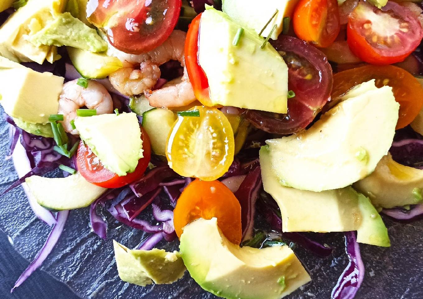 - Cortamos unas rodajas de col verde y de col lombarda, disponemos en una fuente, añadimos el pepino con las gambas y el líquido lo vertemos a un vaso. Lavamos y cortamos los Tomatitos cherry, cortamos el aguacate y añadimos Cortamos el cebollino y lo añadimos. En el vaso del líquido del aderezo de las gambas y el pepino añadimos el aceite, mezclamos bien y lo vertemos por encima. ¡Buen provecho!!!