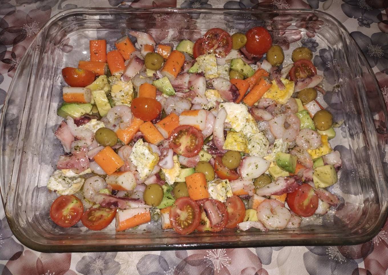 - Juntar en un bol grande, el rejo cocido, los palitos de surimi cortados, las aceitunas, los tomates cherry cortados, las gambas, el aguacate cortado, el huevo cocido.