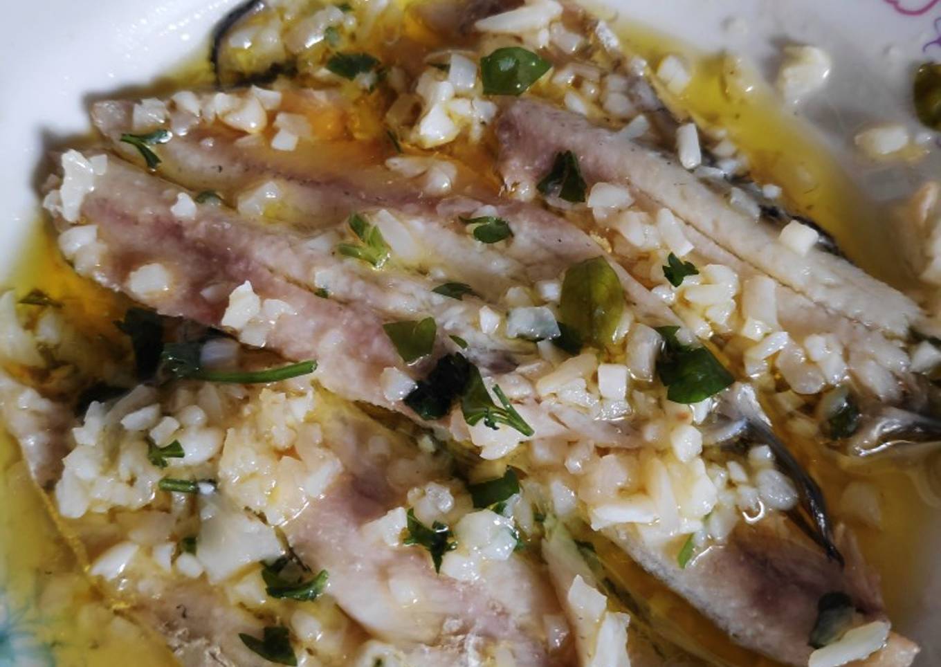 - Bañamos las anchoas con un buen aceite de oliva virgen extra y aderezamos con el ajo y el perejil picado