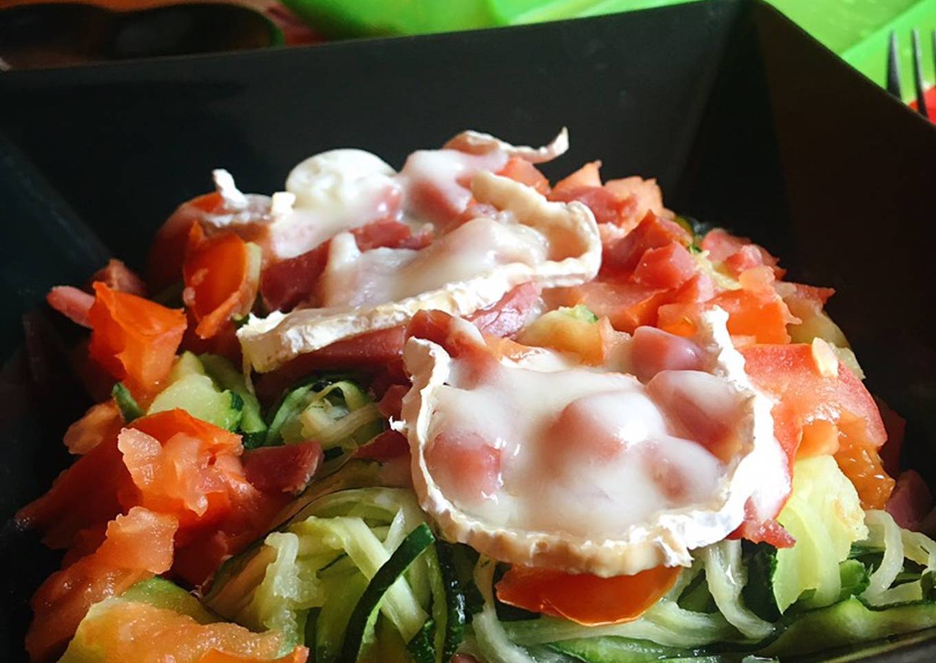 Espaguetis de calabacín con jamón y rulo de cabra al vapor con Lékué